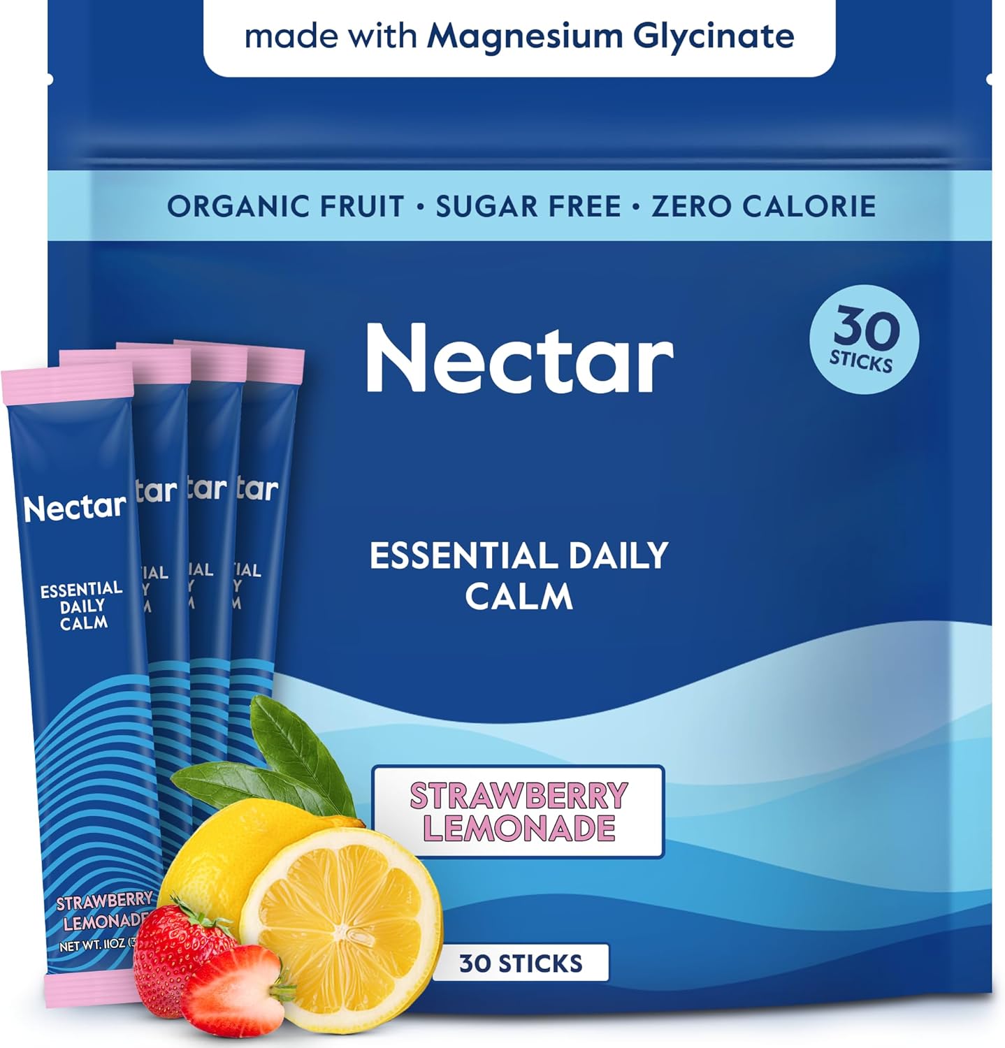 Nectar Calm Magnesium Glycinate Drink Mix, 30 Sticks, with Ashwagandha & L-Theanine